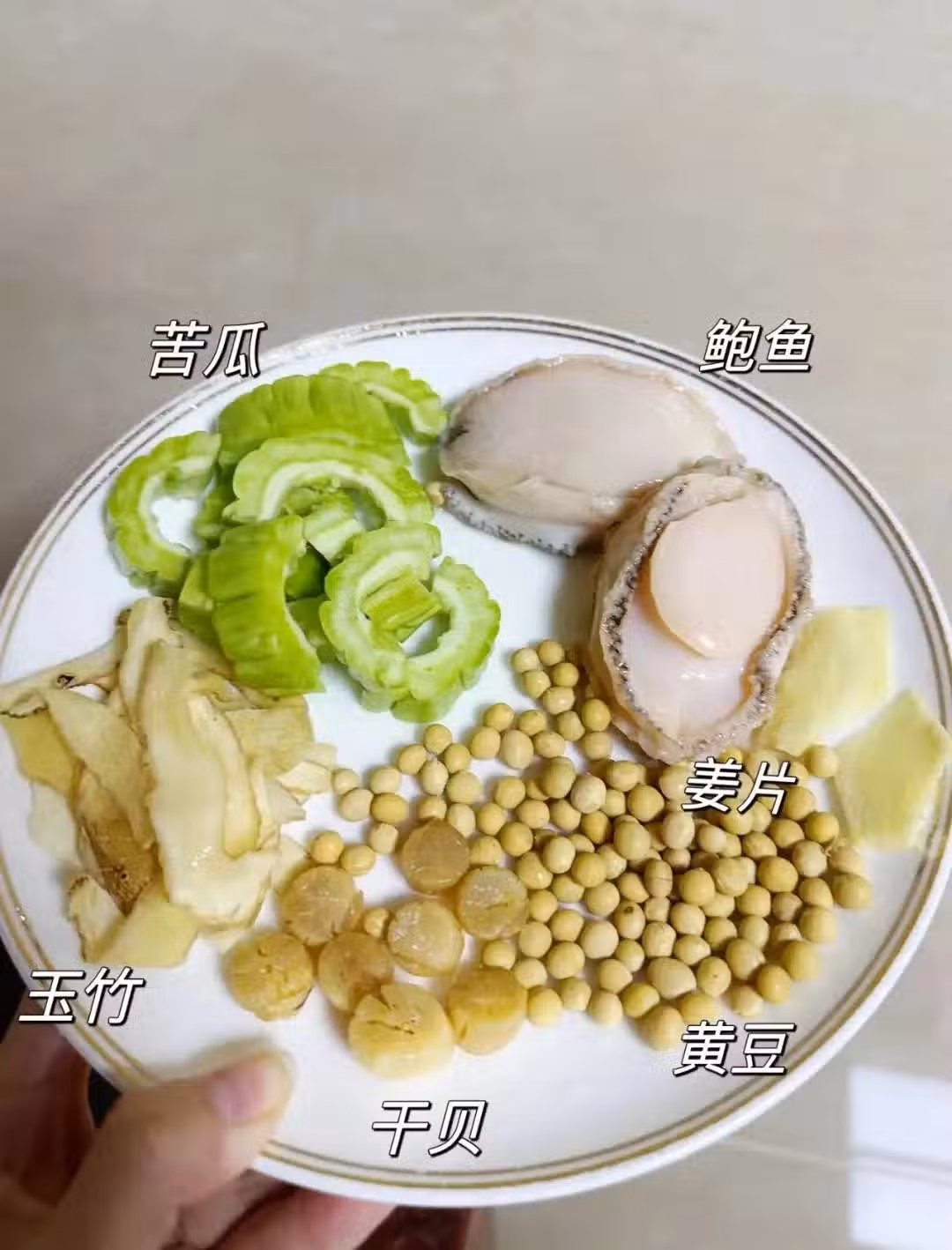 苦瓜,鮑魚,黃豆,乾貝,薑片,玉竹,瘦肉/排骨