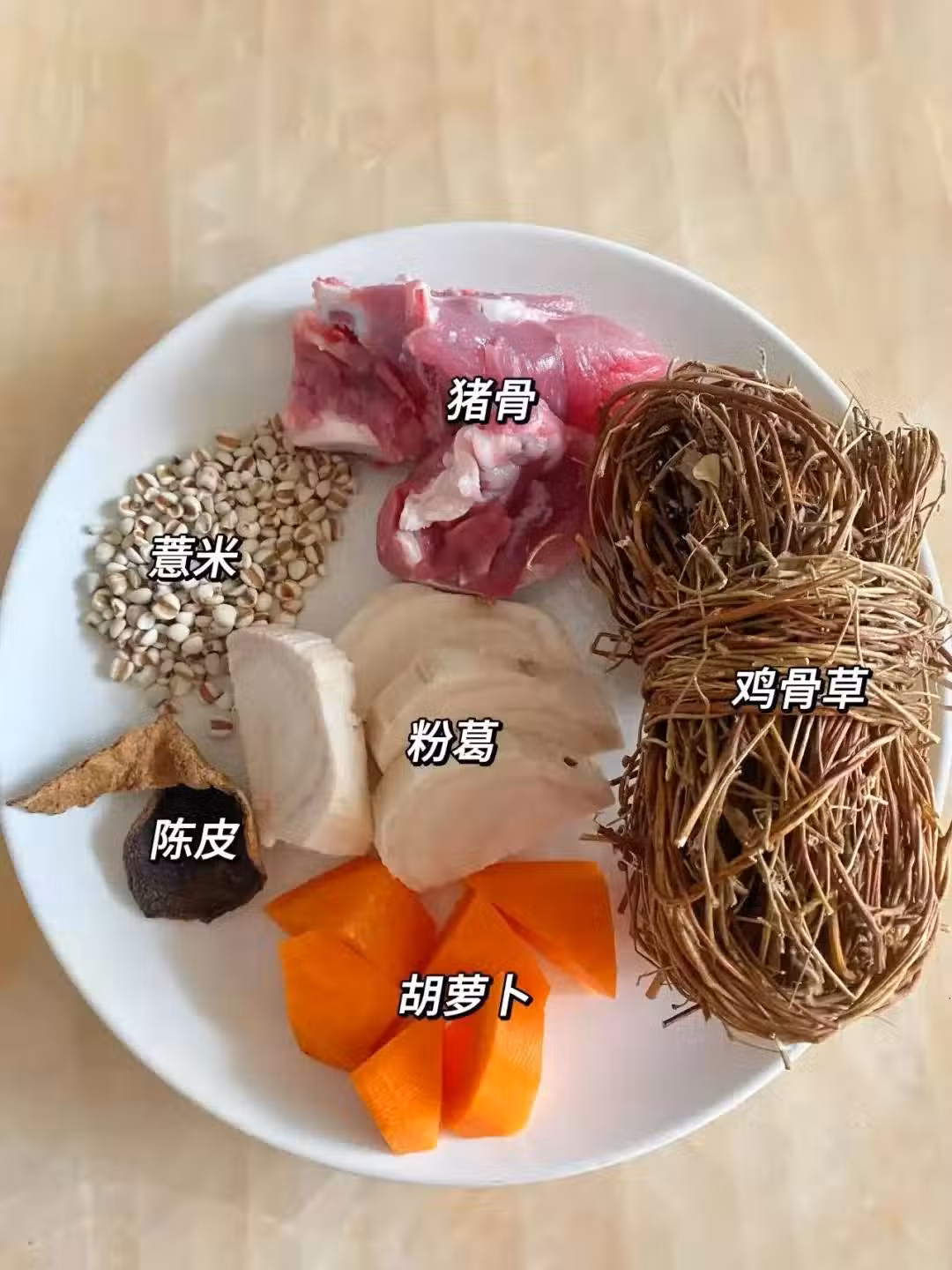 豬骨、雞骨草,胡蘿蔔,陳皮、薏米、粉葛