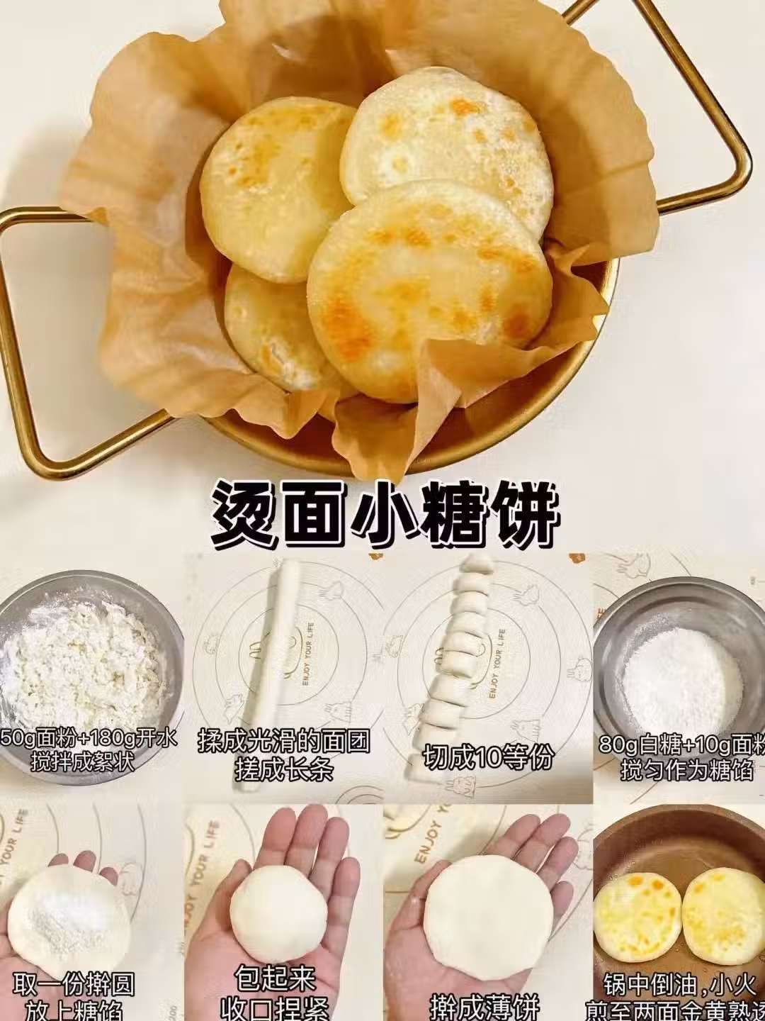 7. 燙麵小糖餅:東北老鐵的甜蜜暴擊 開水燙麵+白糖餡,擀成餅後鍋里一烙,糖心流淌的那一刻,什麼控糖減肥都成了浮雲。 趁熱吃小心燙嘴,別問我是怎麼被燙出表情包的…… 香蔥火腿雞蛋餅