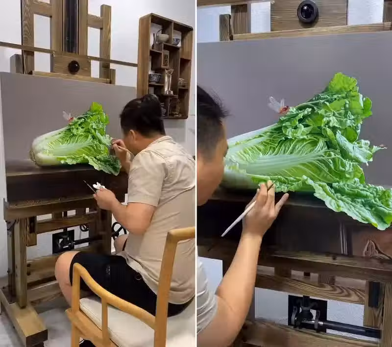 如此逼真的圖案一開始還以為是擺個實物在上面,但如果把影片看完的話,就會發現藝術家是從一開始用鉛筆打底稿,再一層一層上色最終把畫面給填好填滿,若不是這樣從頭開始拍攝,還真的會讓網友覺得這就是一個白菜擺在眼前這樣w