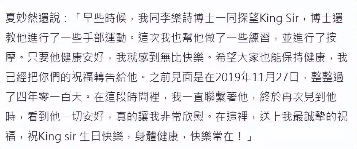 她在文中表示,鍾景輝健康安好讓她無比快樂,已經有四年多沒見面,鍾景輝現在坐輪椅出入,外形消瘦大不如前。
