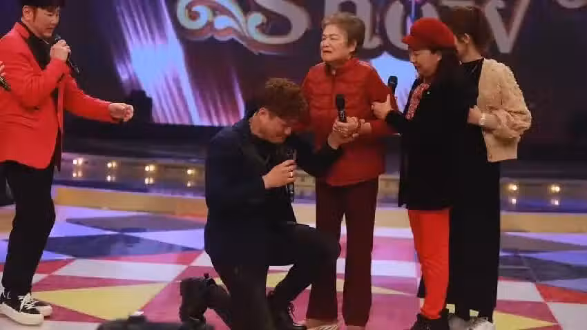 回憶起這段往事,楊哲當場跪地向母親致謝,母子相擁而泣的畫面,讓現場所有人為之動容,主持人白冰冰也在一旁攙扶楊母。