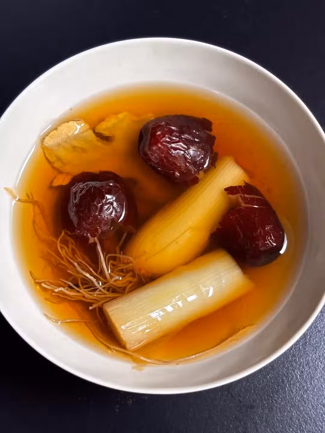 【食材】蔥白3根(帶須)、薑片3片、紅棗4顆(去核)、冰糖少許