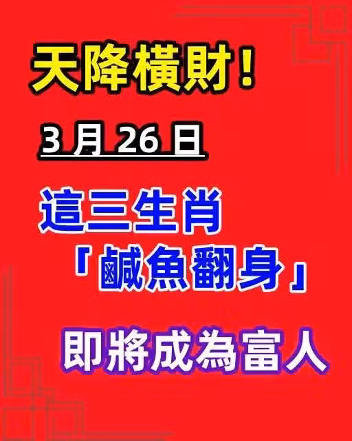 在神秘的生肖運勢中,每個日子都蘊含著獨特的能量與機遇。 而 3 月 26 日,對於某些生肖而言,將是命運轉折的關鍵節點,他們有望擺脫過往的平淡與困境,迎來財運的大爆發,實現從平凡到富有的華麗轉身。 究竟是哪三個生肖如此幸運呢? 讓我們一同深入探究。