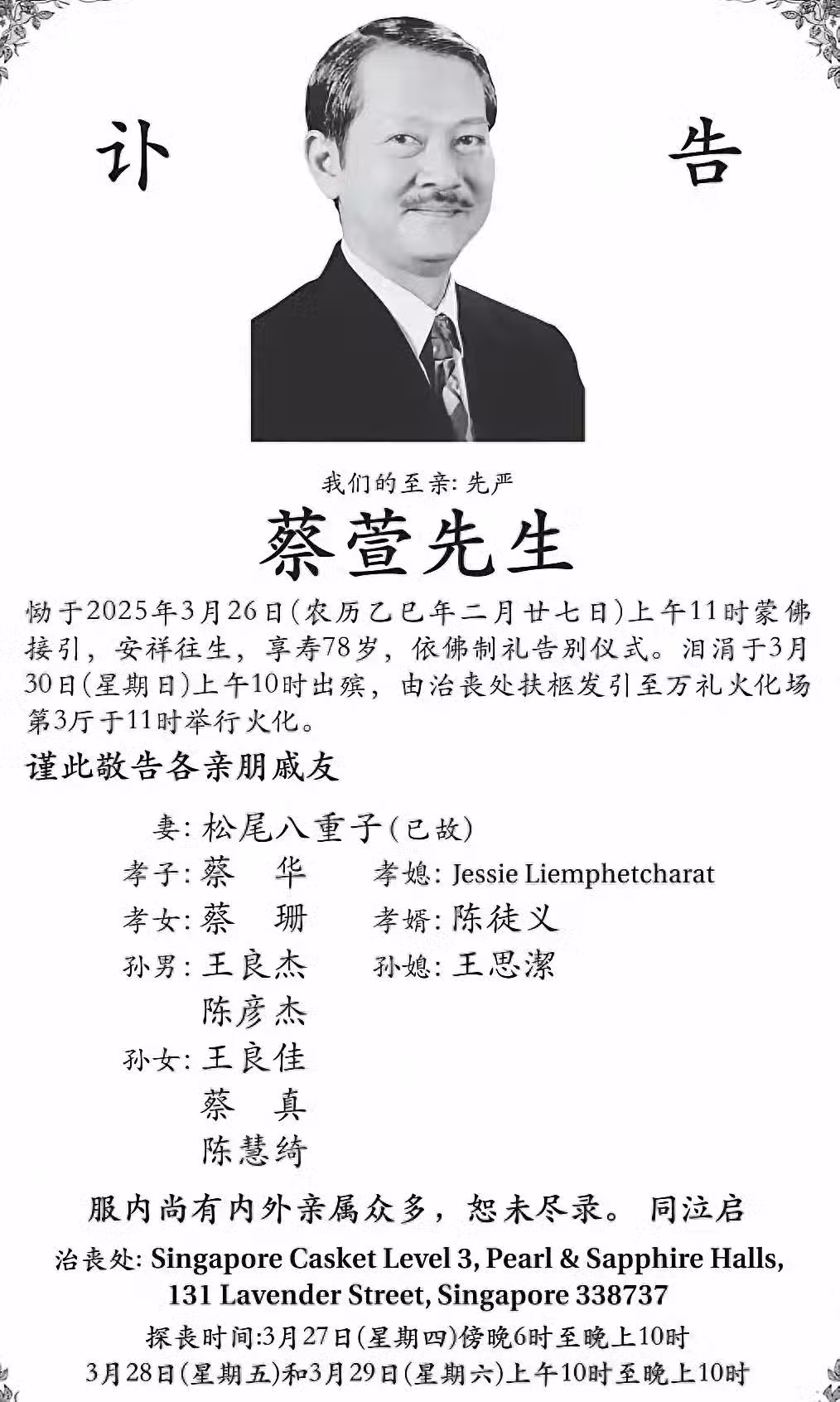 3月26號,蔡瀾的弟弟蔡宣不幸去世,享年78歲。他的家屬發出訃告,稱蔡宣是在3月26號的上午逝世的,他的出殯時間將會在3月30號舉行,而遺體會放在殯儀館三天,27號到29號為探喪時間。訃告中顯示,蔡宣的妻子是日本人,她已經去世,蔡宣的一雙兒女和五名孫子孫女一起守孝。