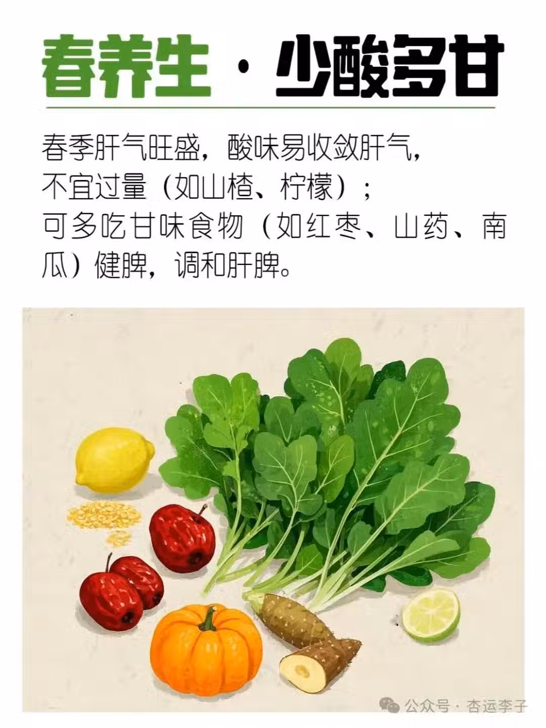 比如說春天,就得少吃酸的,多吃甜的,這樣能健脾養肝;多吃紅色的蔬果,還能補養肝血。煮海鮮這類寒性食物的時候,加點生薑、紫蘇這些溫熱的東西,就能中和寒性。