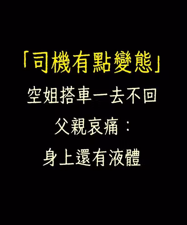 「司機有點變態」空姐搭車一去不回 父親哀痛:身上還有液體