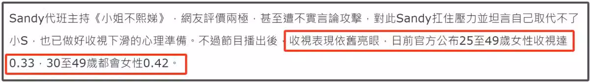 代言合作暫緩、暫停主持錄製,大S離世後,小S已經消失在大眾視線中有一段時間了,沒想到,代班主持《小姐不熙娣》的吳姍儒以黑馬之姿殺出重圍,明明是臨危受命,收視率卻意外飆升,甚至一度登頂榜首,小S要有危機感了。