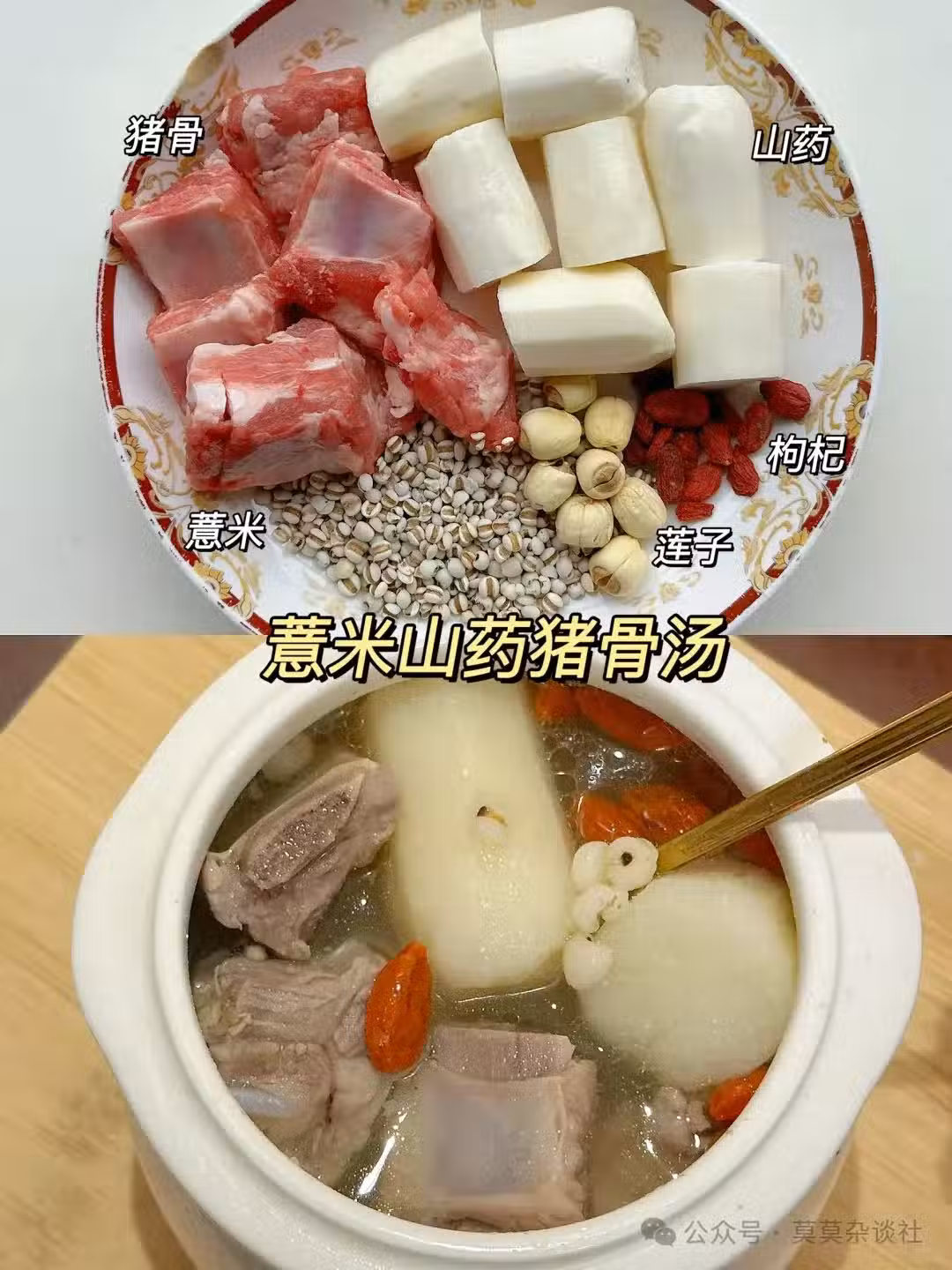做法: 薏米提前浸泡2小時(怕寒的姐妹可以小火炒干再用);豬骨焯水;山藥切塊。一起燉1.5小時,起鍋前放枸杞和鹽。