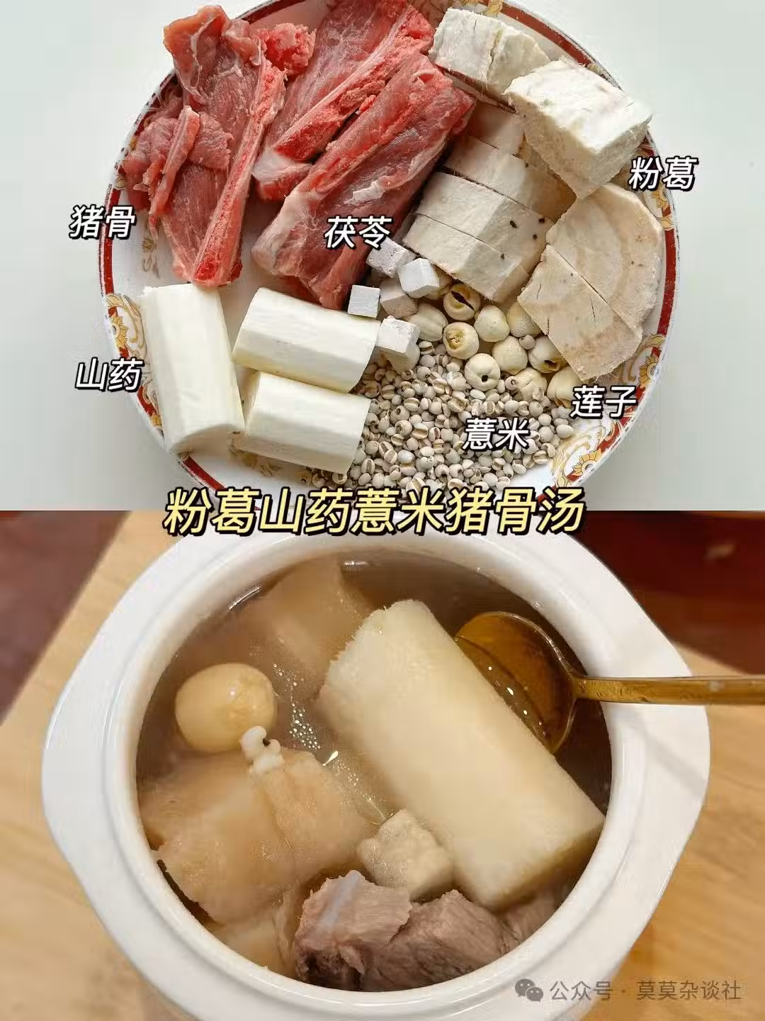 做法: 粉葛削皮切塊;山藥、薏米提前處理好;豬骨焯水。全部材料一起燉煮1小時以上,出鍋撒點蔥花更香~