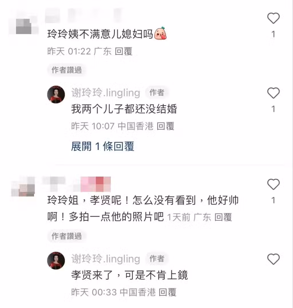 不過,有指謝玲玲並未認可,她受訪時曾表明自己是很開明的媽媽,不會過問子女感情事,但就避談有否見過胡美貽。其後有網民在社交網留言:「玲玲姨不滿意兒媳婦嗎?」謝玲玲點贊該條留言更回覆:「我兩個兒子都還沒結婚。」似乎對胡美貽未滿意。