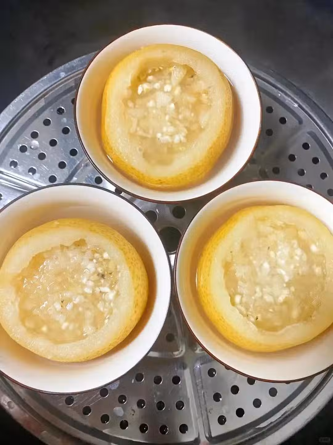 一碗冒著熱氣的川貝冰糖蒸梨就出爐啦!品嘗時,可先喝清甜的湯汁,再吃軟糯的梨肉,享受美味與健康的雙重滋養。