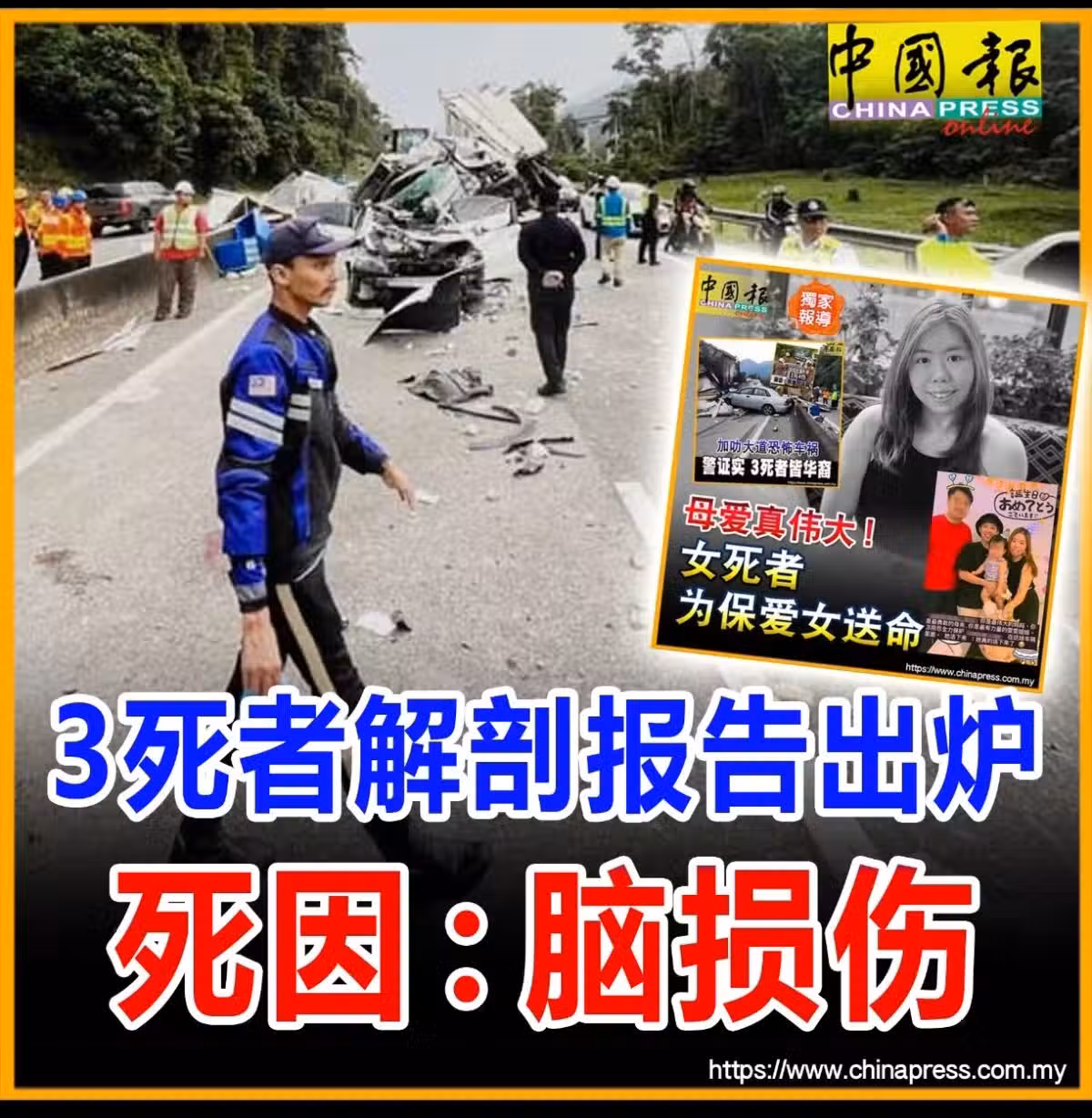 這場奪命車禍發生在加叻-吉隆坡大道50.8公里處,一輛從關丹開往吉隆坡的3噸羅里在行駛過程中失控,越過道路分界堤沖入對面車道,與另外4輛車相撞。