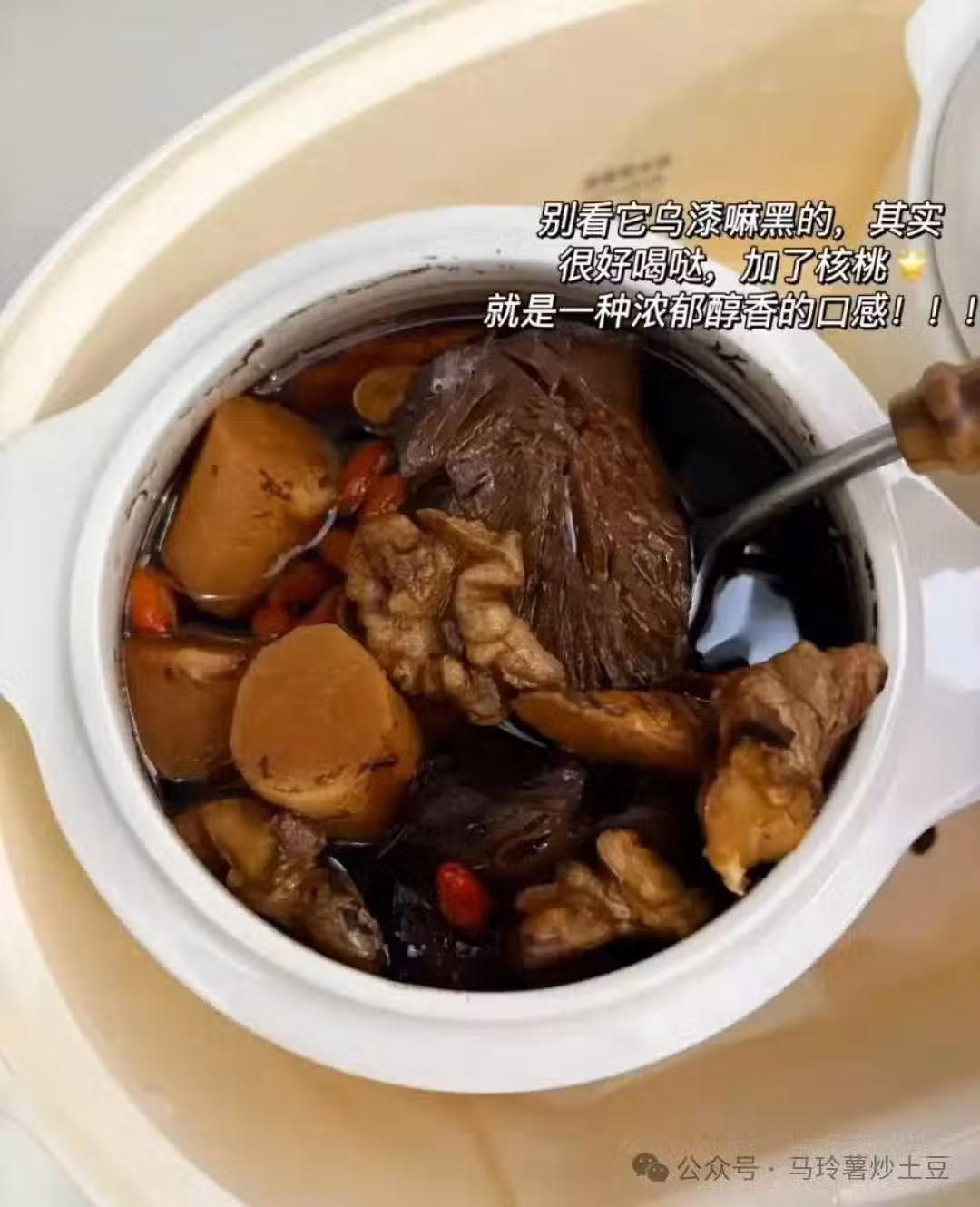總結:整個湯加了核桃特別的醇香,需要加少許鹽引入腎經,適合平時工作壓力大、頭腦風暴、鬚髮早白、精力差的人!!