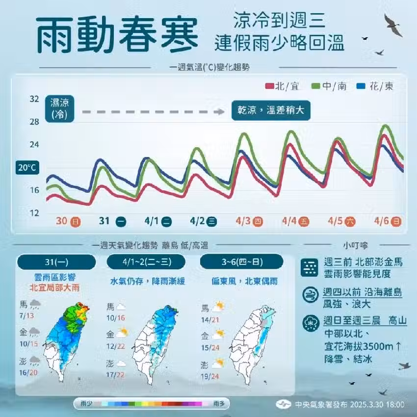 而周二 (1) 、周三 (2) 的天氣狀況,中央氣象署提到,冷氣團稍減弱,水汽仍多,北部、東半部、恆春半島及中南部山區有局部短暫雨;周四 (3) 東北季風影響,基隆北海岸、東半部及恆春半島有局部短暫雨,北部亦有零星短暫雨;周五 (4) 東北季風減弱,氣溫回升;周日 (6) 東半部及恆春半島有局部短暫雨,北部亦有零星短暫雨。