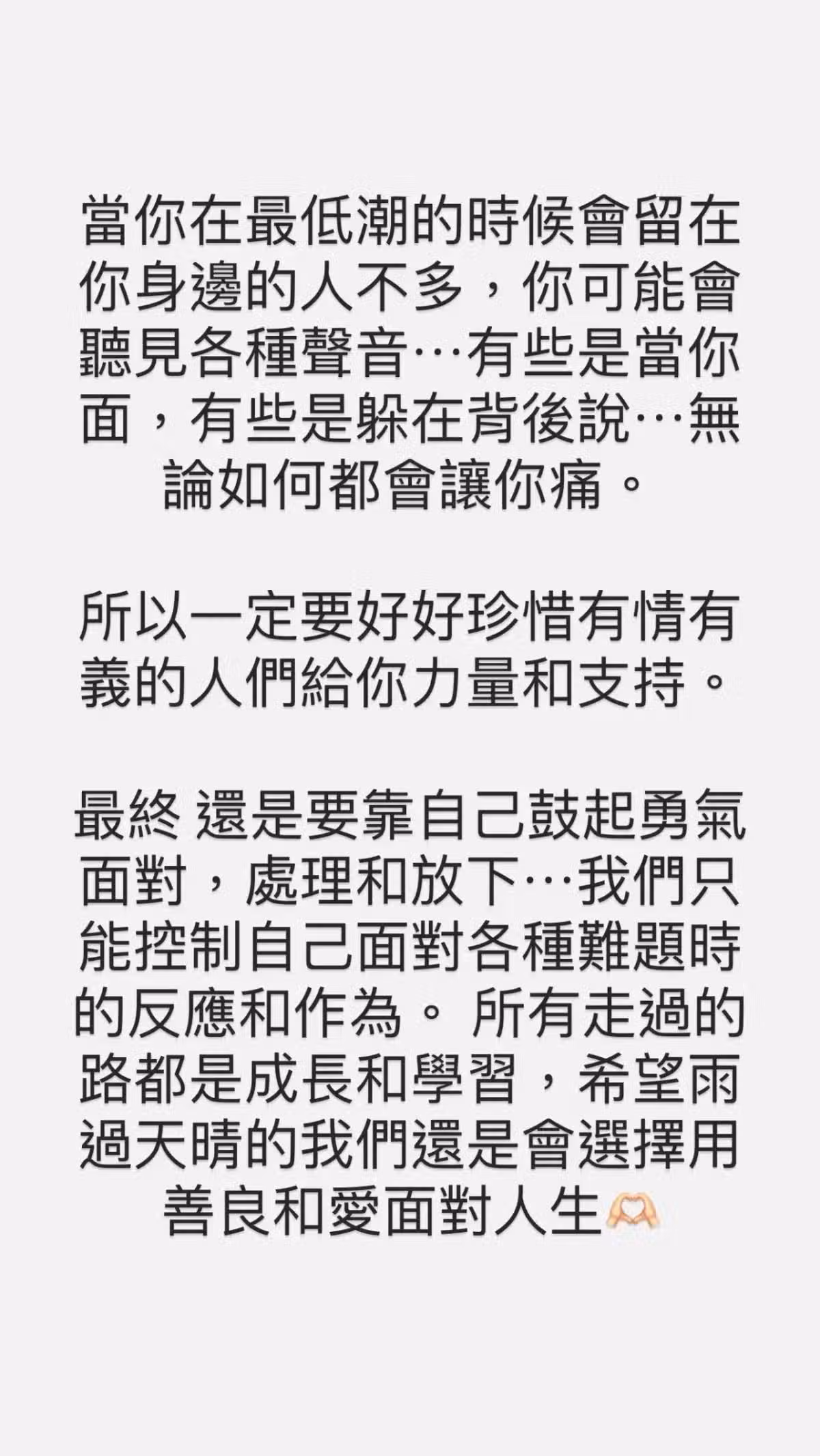 Melody:我們只能控制自己面對的各種難題的反應和作為。所有走過的路都是成長與學習,希望雨過天晴的我們,還是會選擇用善良和愛來面對人生。