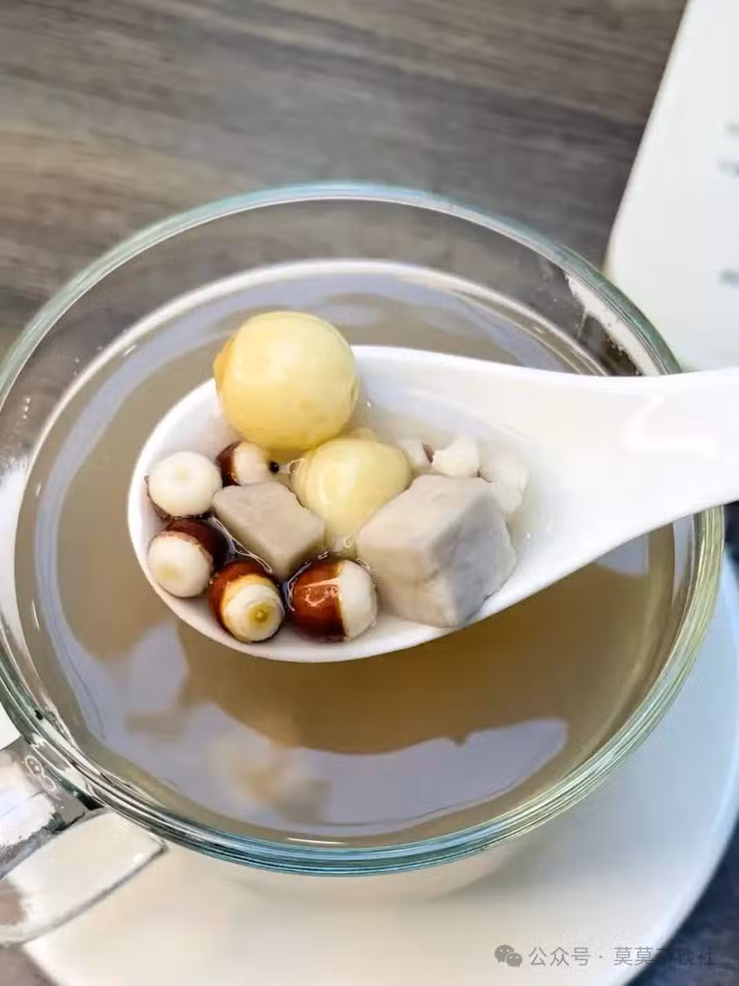功效:茯苓健脾安神、利濕消腫;芡實補腎固精、改善脾虛泄瀉;蓮子養心安神、補脾止瀉;山藥補脾養胃、潤膚抗衰。適合脾虛濕重、皮膚鬆弛、面部浮腫、容易腹瀉的女性。