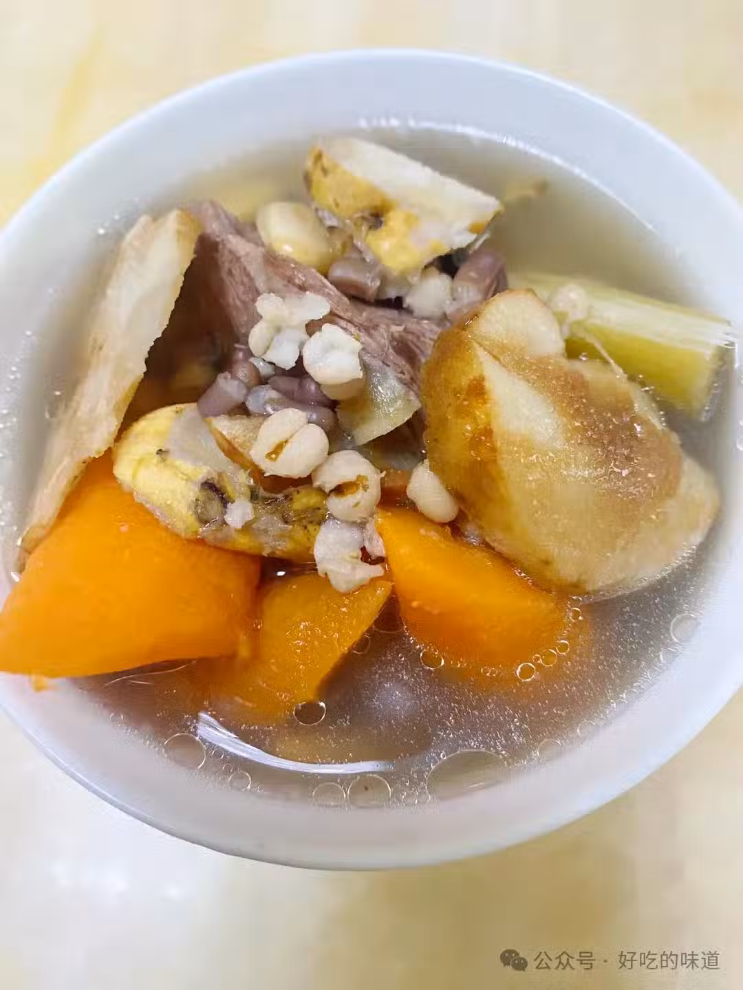 【食材準備】:豬骨500克、土茯苓50克、牛大力50、竹蔗兩節、薏米10克、扁豆10克、赤小豆20克、胡蘿蔔一根