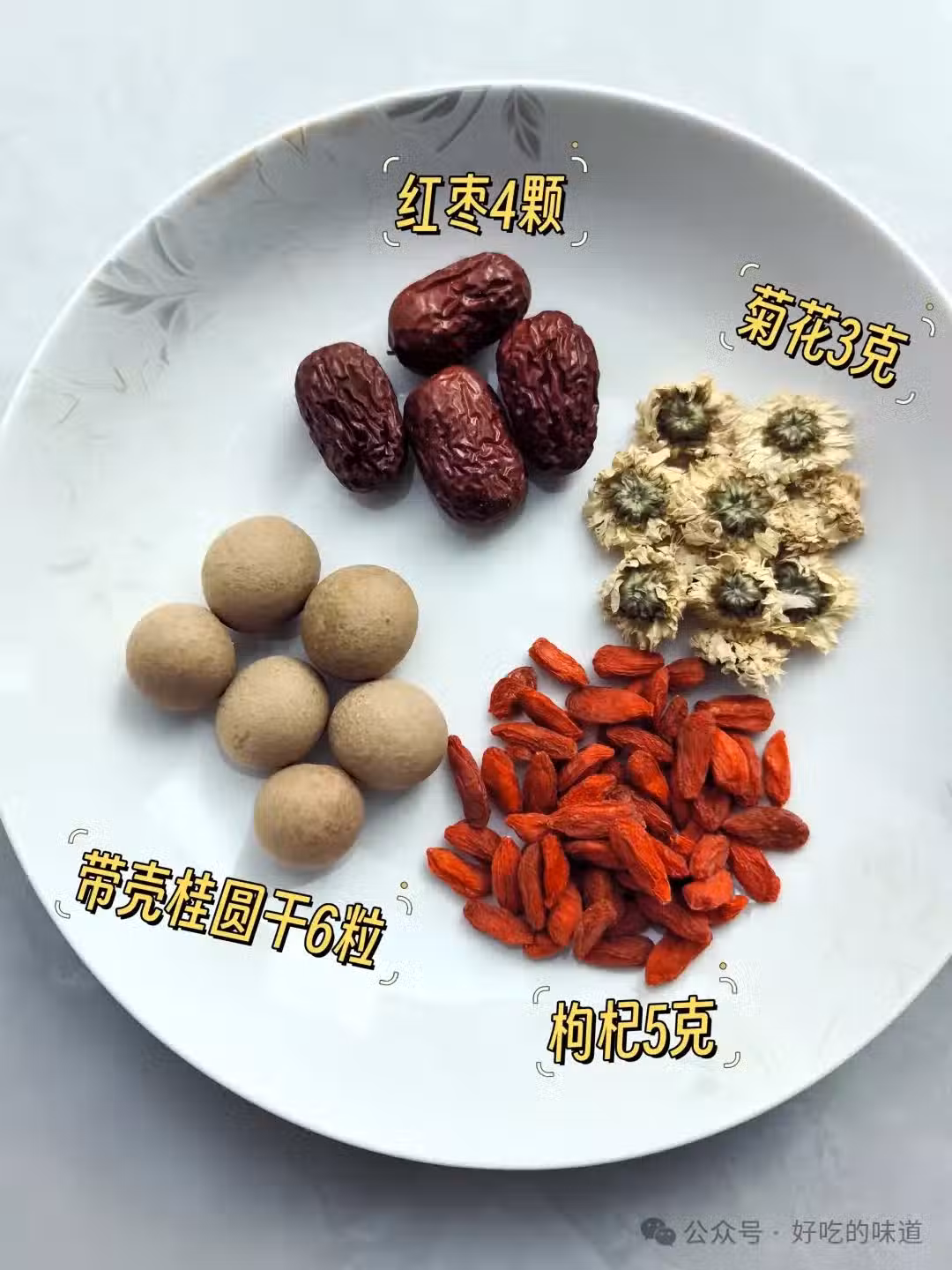 【做法步驟】:將桂圓乾和紅棗加水煮30分鐘左右,用煮過的水沖泡枸杞和菊花。如果不方便煮水,也可以把所有原料用沸水沖泡,燜20分鐘後飲用,可以反覆沖泡。