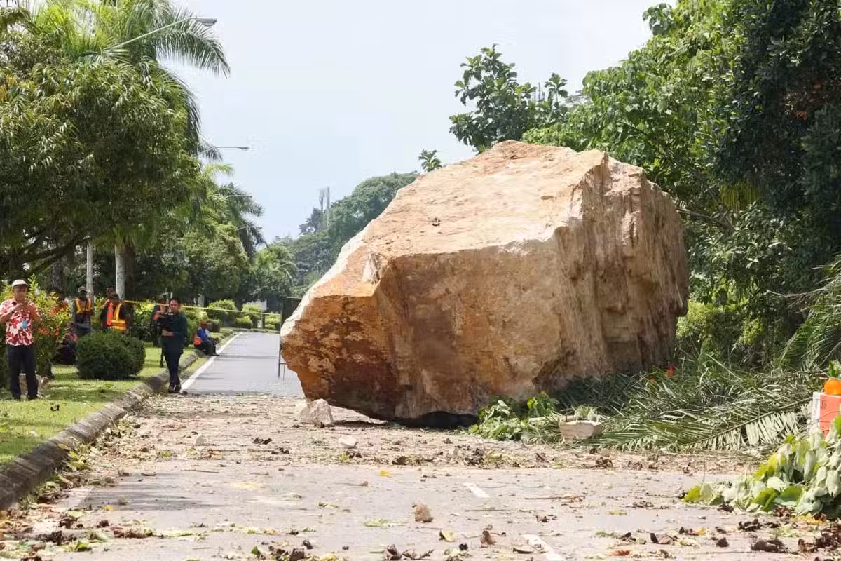 據了解,一塊約4米高、11米長的巨石,今早從山上滾落,所幸事發時正值交通低峰期,且鄰近學校正放開齋節假期,才沒有造成人命傷亡。