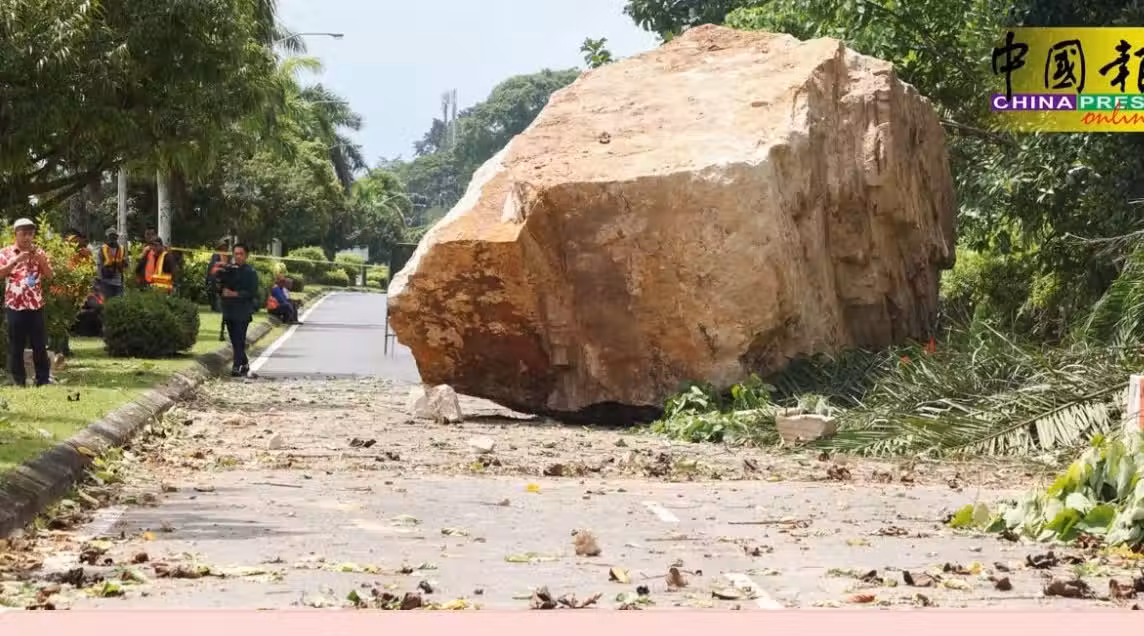 一塊堪比2人高的巨石從山坡滾落,場面觸目驚心。