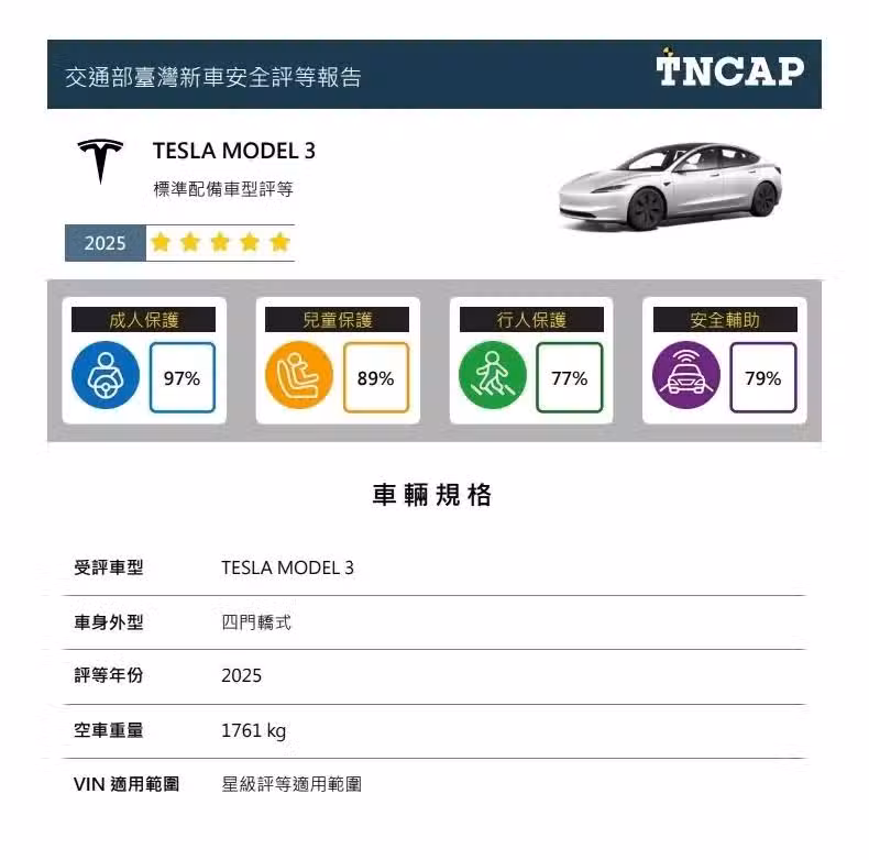 TNCAP 最新撞測評等出爐!Tesla Model 3 獲五星評價、Honda HR