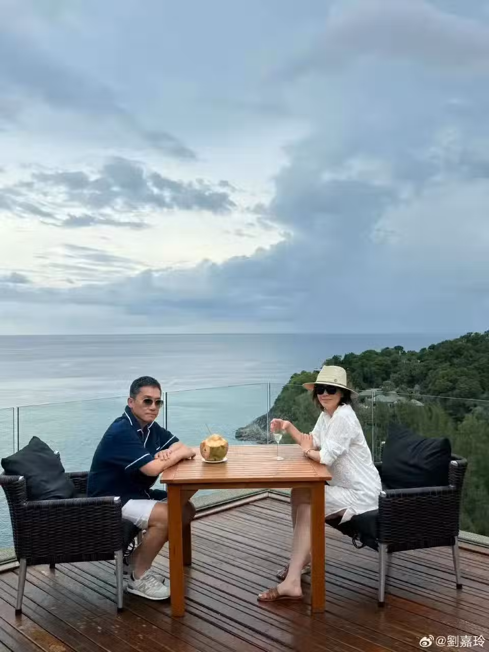 照片中,劉嘉玲戴著墨鏡和帽子,身穿白色襯衫連衣裙,搭配編織包包,一身法式度假風打扮鬆弛感滿滿。梁朝偉戴著墨鏡,身穿藍色襯衫和白色短褲,休閒裝打扮看起來酷帥十足。夫婦倆在海邊喝著飲品,享受美好假期。