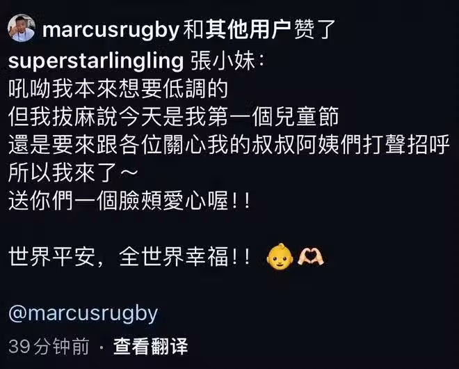 洪小玲的老公張天霖公開了女兒的乳名叫「張小妹」,他以女兒的口吻發文:我本來想要低調的,但是我爸媽說今天是我第一個兒童節,還是要來和各位關心我的叔叔阿姨們打聲招呼。