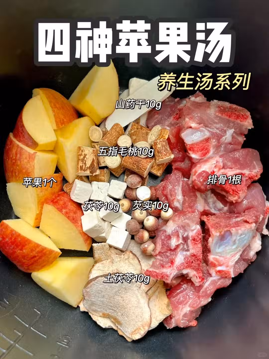 食材: 蘋果1個、山藥干10g、五指毛桃10g、茯苓10g、芡實10g、土茯苓10g、排骨1根 做法: 排骨焯水,倒入600ml清水,放入食材,電高壓鍋一鍵煲湯。