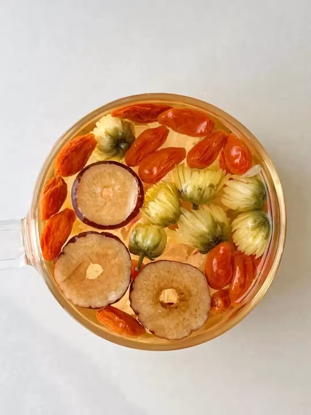 胎菊2克、玫瑰花3克、桂圓5克、枸杞2克、紅棗3顆