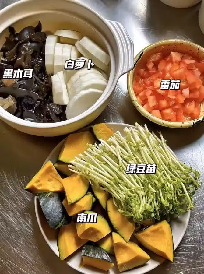 食材大公開:南瓜、西紅柿、白蘿蔔、綠豆苗、黑木耳,這些色彩斑斕的蔬菜,可都是五臟的好朋友哦!🥦🍅🥕🥒🥦