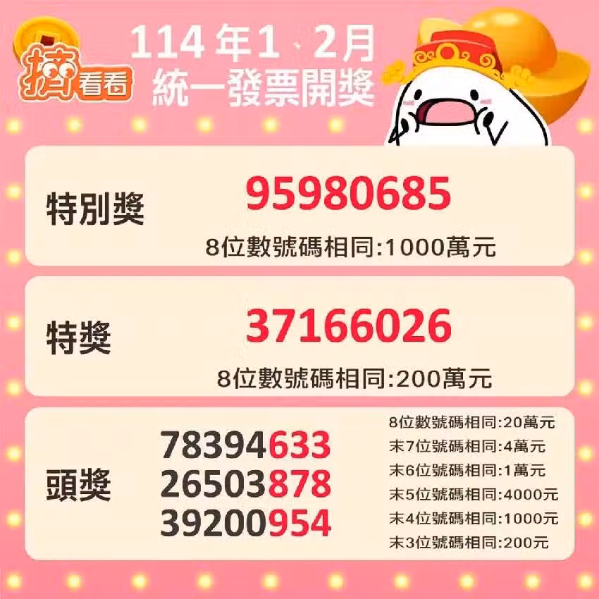 114年1、2月期統一發票號碼曝光,千萬特別獎號「95980685」、200萬特獎「37166026」,其中11名幸運兒中獎千萬,超商7-11有2張、全家2張、全聯1張,連汽車加油都中1張。