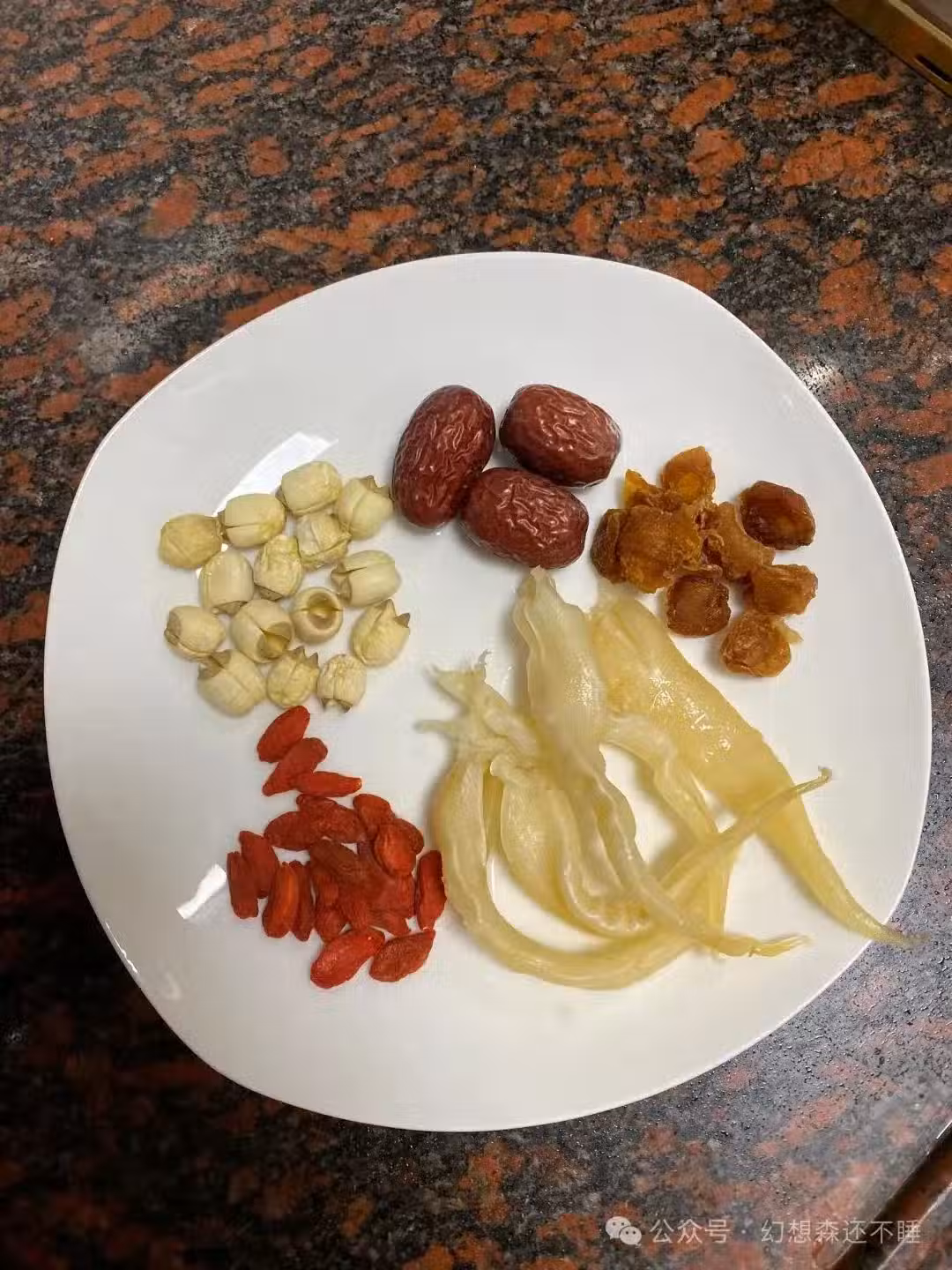 蓮子20g,桂圓十顆,魚膠5-6個,紅棗5-6顆,枸杞10-15粒