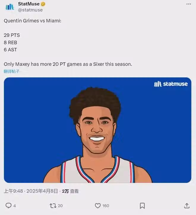 4月8日,NBA常規賽:76人客場105-117不敵熱火,遭遇12連敗。此役76人球員格萊姆斯25投11中,三分11中4,罰球6中3,砍下29分8籃板6助攻1搶斷!過去14場比賽,格萊姆斯有13場得分20+,已經成為76人大腿。
