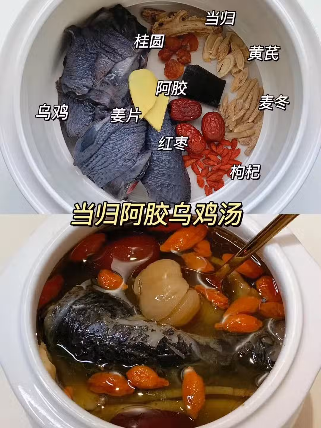 當歸、阿膠和烏雞都具有補血作用,能有效改善貧血症狀,如面色蒼白、頭暈乏力等。