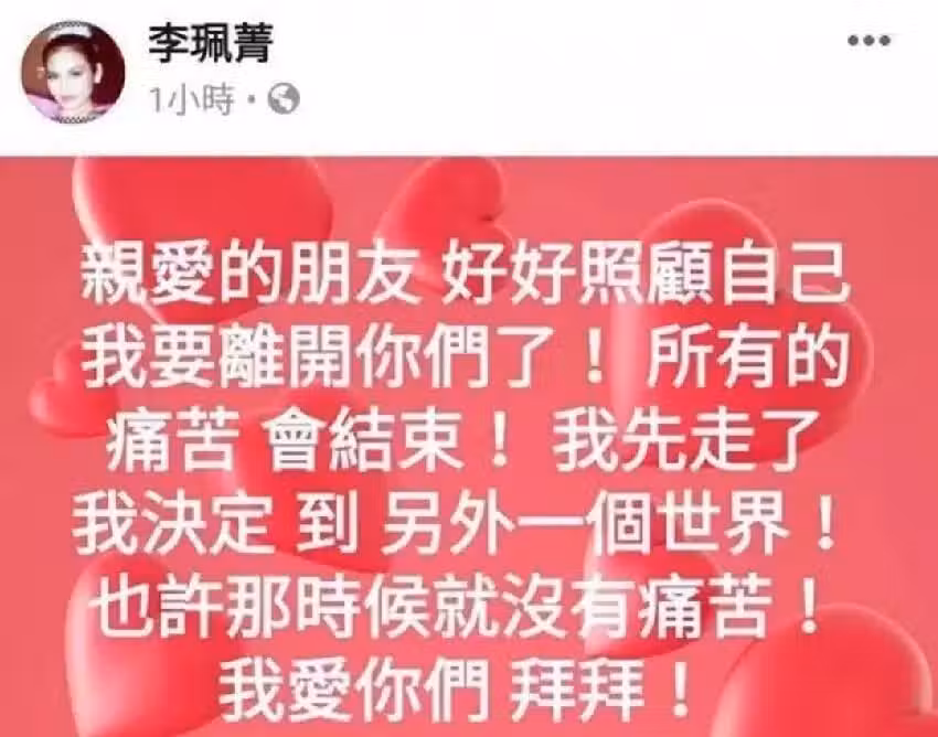 而在吞藥之前,李佩菁還透過社交網絡留書,向世界告別,李佩菁在PO文中寫道:「親愛的朋友,好好照顧自己,我要離開你們了!所有的痛苦會結束!我先走了。