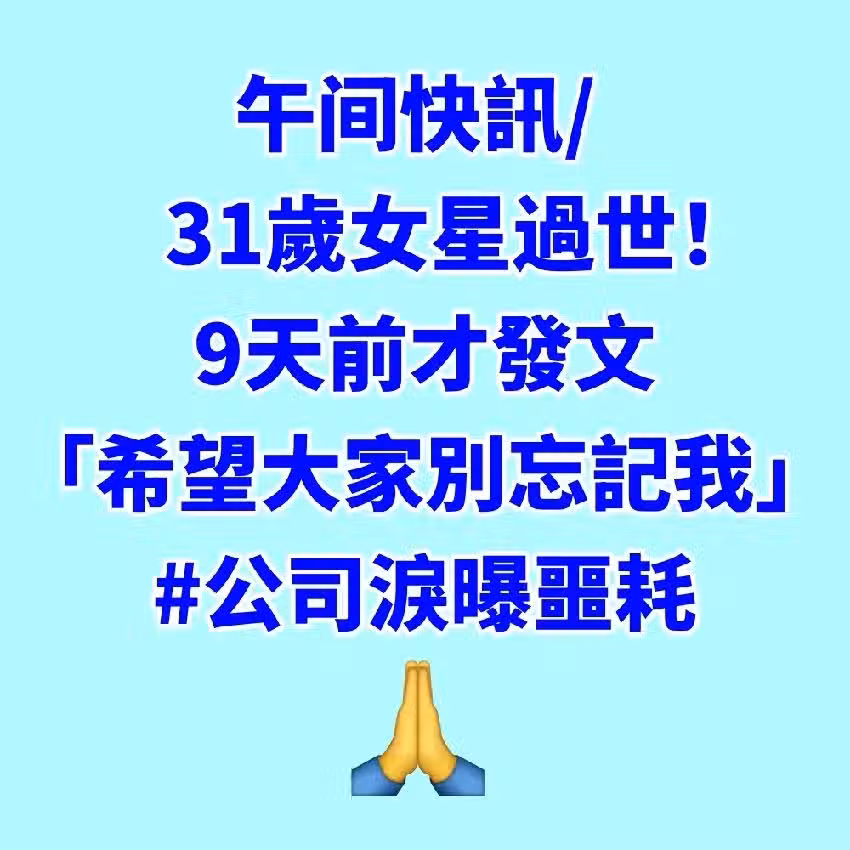 午間快訊/31歲女星過世!9天前才發文「希望大家別忘記我」#公司淚曝噩耗