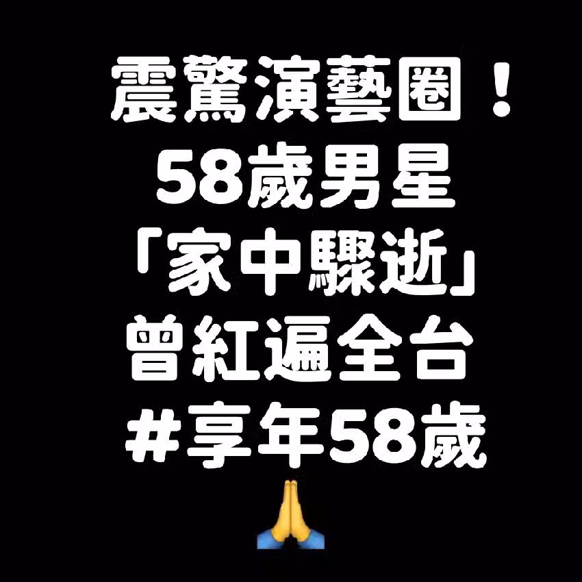 震驚演藝圈!58歲男星「家中驟逝」曾紅遍全台 #享年58歲..............