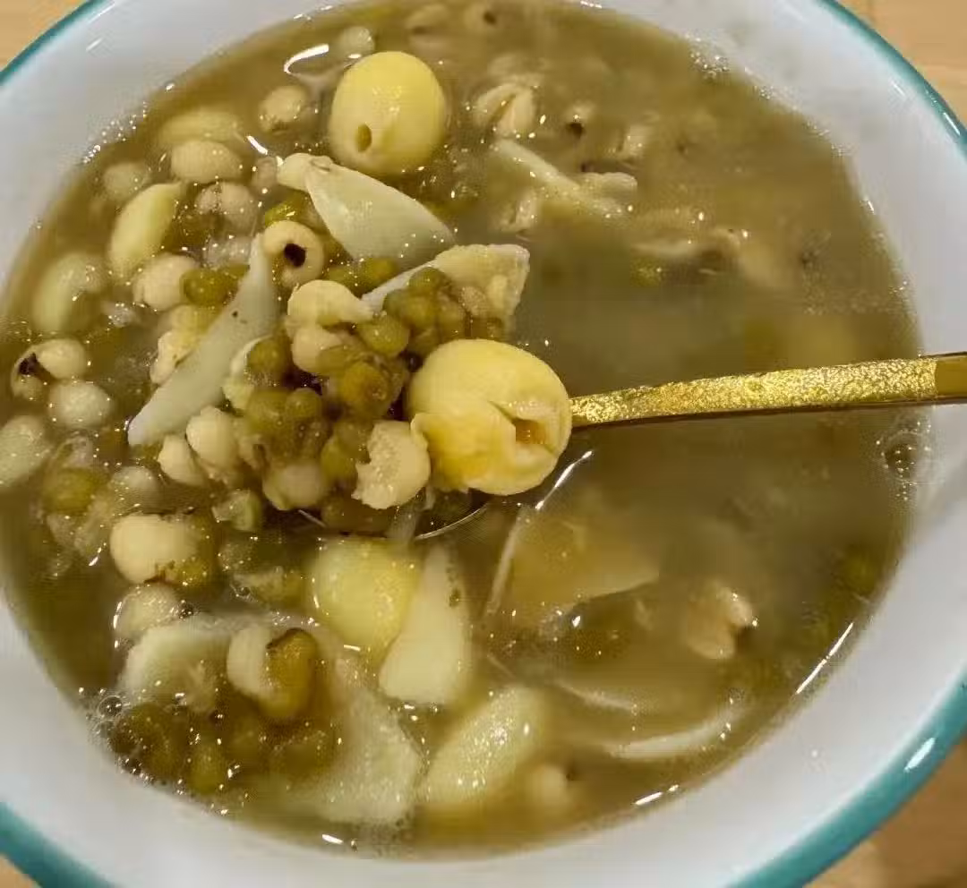 【✅食材準備】 : 綠豆80克、熟薏米80克、百合30克、蓮子20克、冰糖20克; 【✅做法】 : 1、提前把百合、蓮子、薏米、綠豆清洗乾淨,浸泡3小時以上; 2、接著把蓮子、薏米、綠豆倒入鍋中,加入適量清水煮開,轉中小火煮至綠豆開花; 3、加入泡好的百合繼續煮20分鐘; 4、最後加入適量冰糖煮至融化即可飲用;