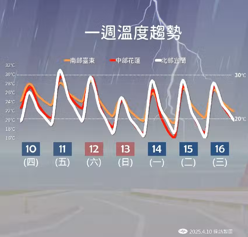 (11日)鋒面尾端將移至東南方海面,花蓮及台東地區有較高機率降雨,桃園以北地區則僅有零星降雨。