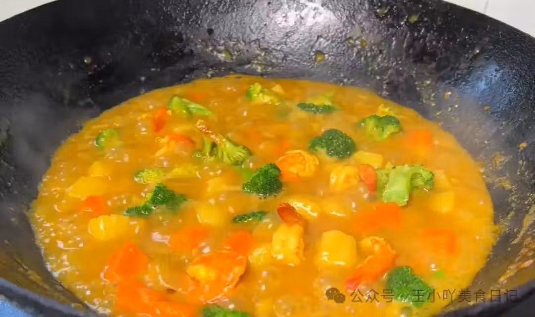 在燉煮過程中,用鏟子適當攪拌,讓咖喱塊充分融化,使湯汁均勻包裹食材。持續燉煮七八分鐘,期間觀察食材的熟爛程度,當土豆變得軟糯,大蝦熟透,湯汁變得濃稠時,咖喱大蝦就燉煮好了。