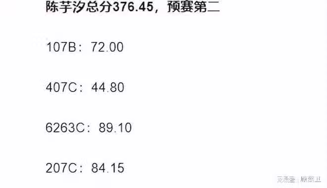 她是預賽中唯一4開頭總分的選手,成功晉級決賽。