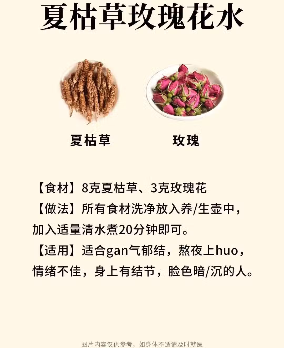 夏枯草山楂水:夏枯草和山楂都具有清肝明目的功效。 夏枯草能消腫散結,山楂能活血化瘀,二者搭配使用能緩解機體腫脹、疼痛的情況。山楂能促進胃腸道蠕動,有助於消化,與夏枯草一起泡水喝能達到健脾和胃。山楂具有行氣散瘀的功效,能緩解消化不良的情況。