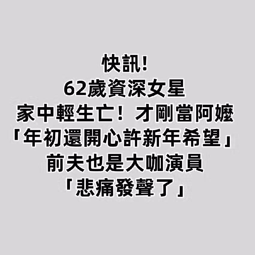 快訊/62歲資深女星家中輕生亡!才剛當阿嬤「年初還開心許新年新希望」 前夫也是大咖演員「悲痛發聲了」!