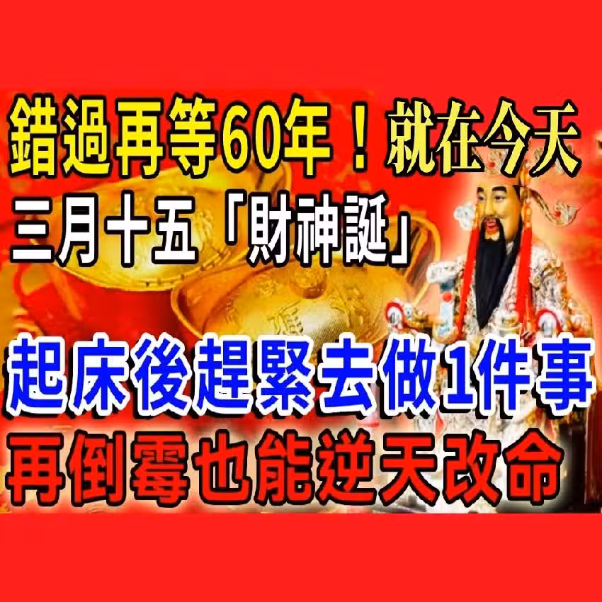 🙏 錯過今天,要再等60年! 今天是農曆三月十五日,正是五路武財神聖誕日,是百年難得一見的大開財門之日。 傳說中,這一天武財神會巡察人間,為有「正財心、誠心愿」的人打開財庫!