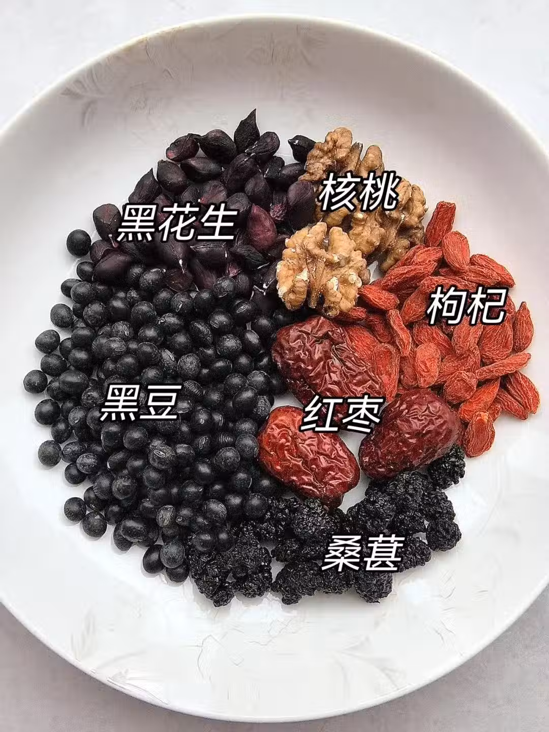 食材:黑豆、桑葚、黑花生、核桃、枸杞各一把,紅棗3-4顆