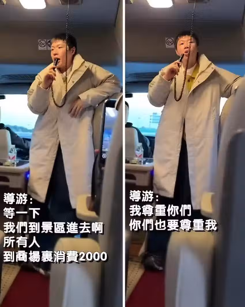 視訊中的故事引人髮指:一位導遊竟然在車上公開喊囂,著著遊客在某地消費滿2000元,據稱如果買不夠,就不允許車輛離開。