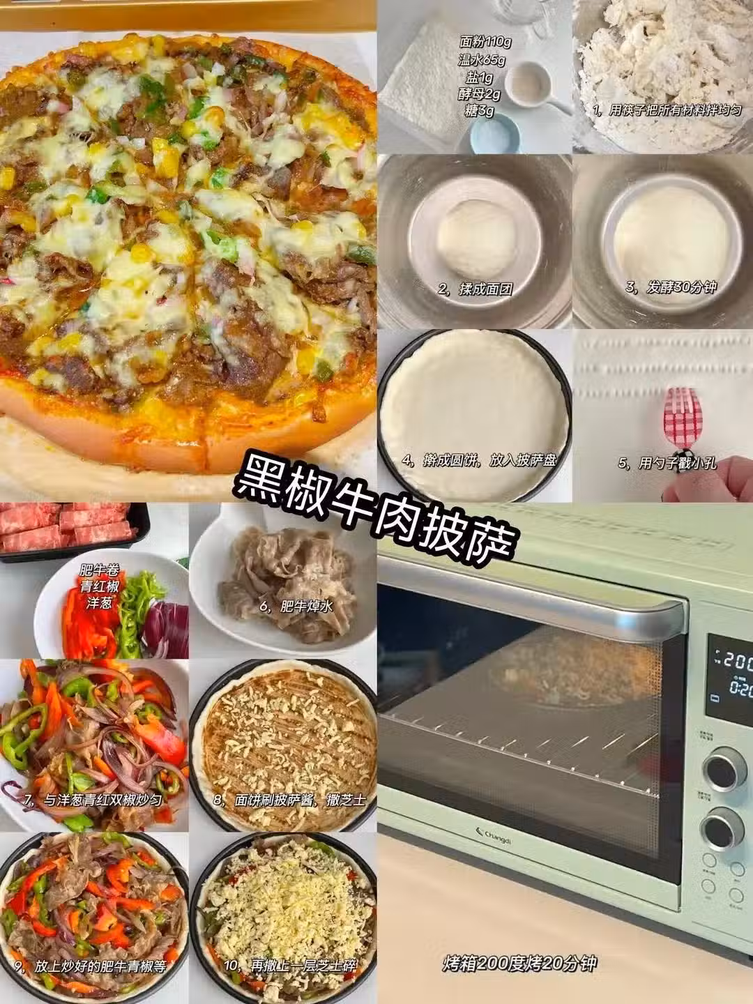 黑椒牛肉披薩:社畜の續命神器,打工人下班別emo! 肥牛和現磨黑胡椒在烤箱裡瘋狂蹦迪,趁熱咬下去爆汁的肥牛和拉絲芝士瞬間治癒996創傷。別問熱量,問就是"蛋白質大補"!