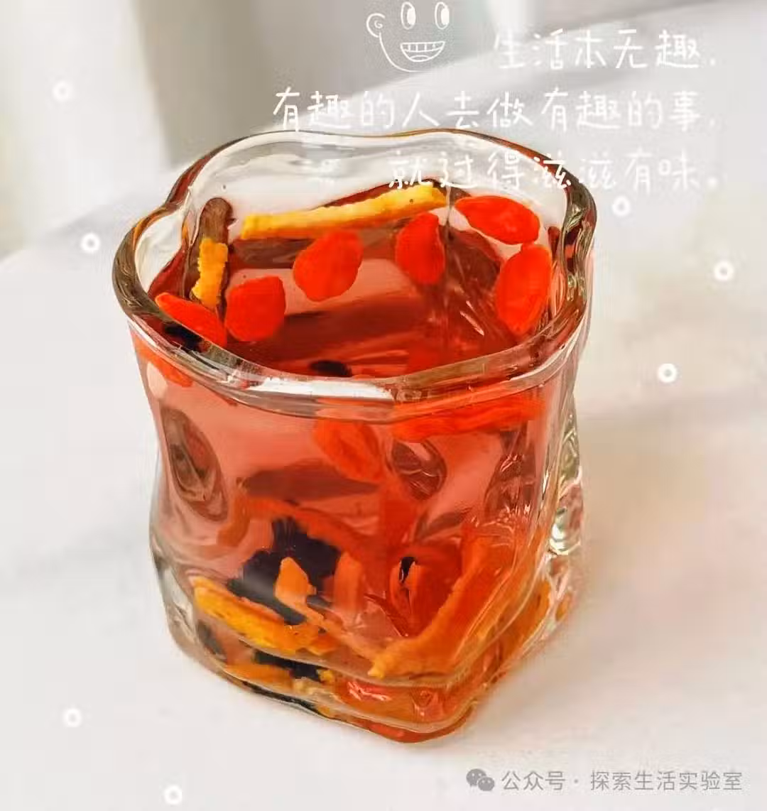 把桑葚和陳皮洗乾淨,一起放到杯子裡,用溫水沖泡後,燜個5 - 10分鐘,等陳皮和桑葚的味道充分釋放出來,加入點枸杞,就可以喝啦,特別方便。