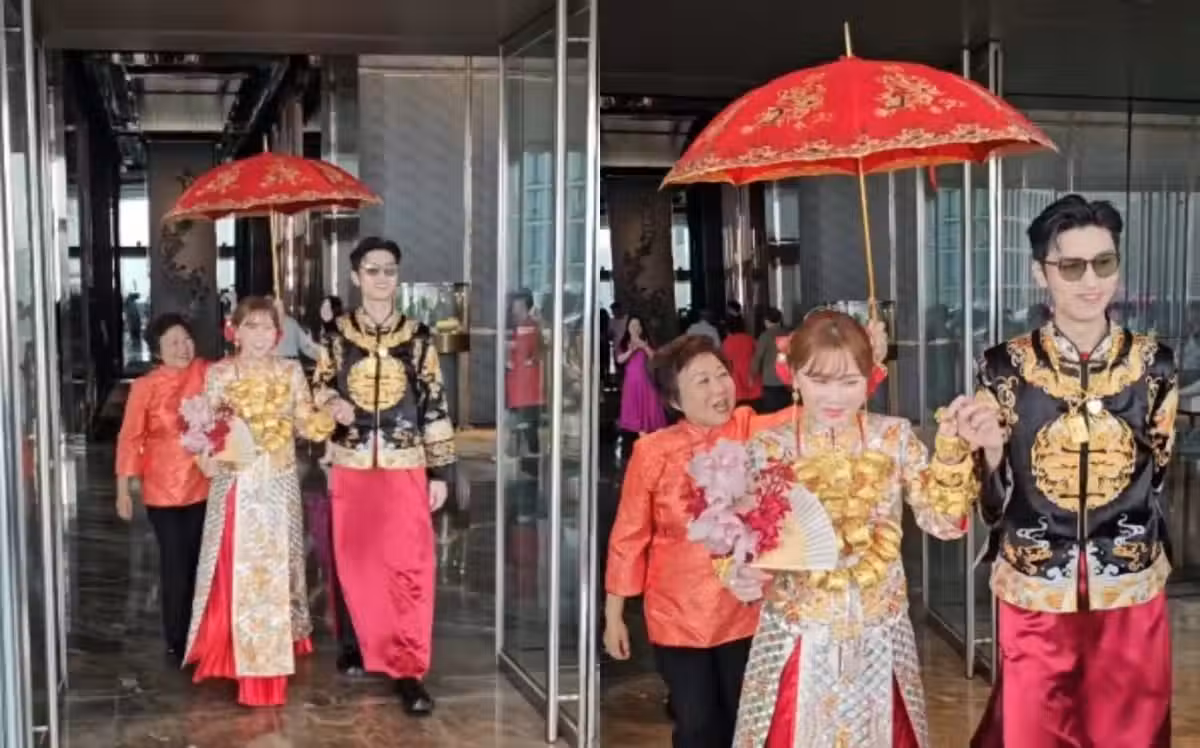 所以完成接新娘儀式後,譚杏藍變成「金人」出門,一對又一對的巨型龍鳳鈪不單戴滿手,甚至連脖子上都掛滿,幾乎將上半身全面覆蓋,在兄弟姊妹列隊拍手下上花車,儼如公主出嫁。譚杏藍連新房都相當奢華,房中放滿了鮮花,營造出浪漫的氛圍。